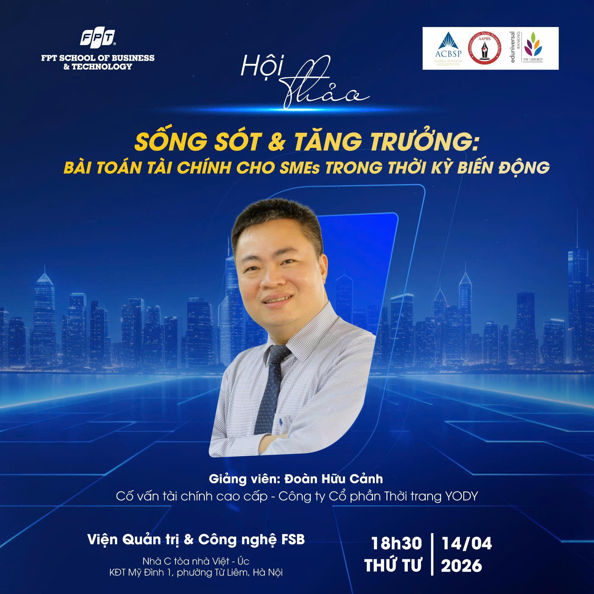 Nhằm đồng hành cùng các doanh nghiệp tháo gỡ những “nút thắt” trong quản trị tài chính, từ đó xây dựng nền tảng vững chắc cho sự phát triển bền vững, Viện Quản trị & Công nghệ FSB, Trường Đại học FPT tổ chức Hội thảo: “Sống sót & tăng trưởng: Bài toán tài chính cho SMEs trong thời kỳ biến chuyển”.